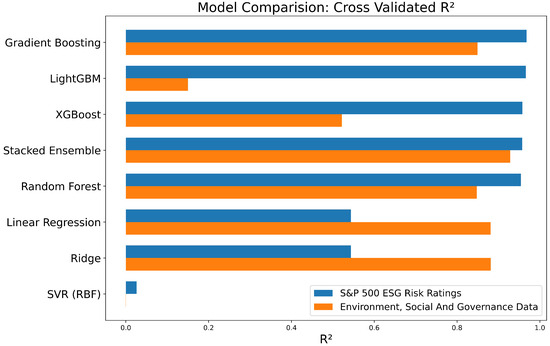 Concerning the cross-validated , the tree-based ensembles significantly outperform the linear and kernel methods. In the S&P 500 ESG Risk Ratings dataset, gradient boosting has the best mean cross-validated , with the highest value of 0.968 ± 0.007, and LightGBM and XGBoost have similar results of 0.966 and 0.958, respectively (Figure 6). The stacked ensemble and random forest have the strongest predictive abilities, with mean values of 0.954 to 0.957 and standard deviations of 0.005 to 0.020, which reflects consistent prediction through the cross-validation folds. Linear regression and ridge regression, on the contrary, attain moderate accuracy ( = 0.544 ± 0.13–0.14), whereas support vector regression shows very low explanatory accuracy ( = 0.03 ± 0.15). In the environmental, social and governance data, stacked ensemble has the best mean cross-validated , with the highest value of 0.9285. The overall finding of these results is that non-linear tree ensembles give significantly better and more stable predictive performance.