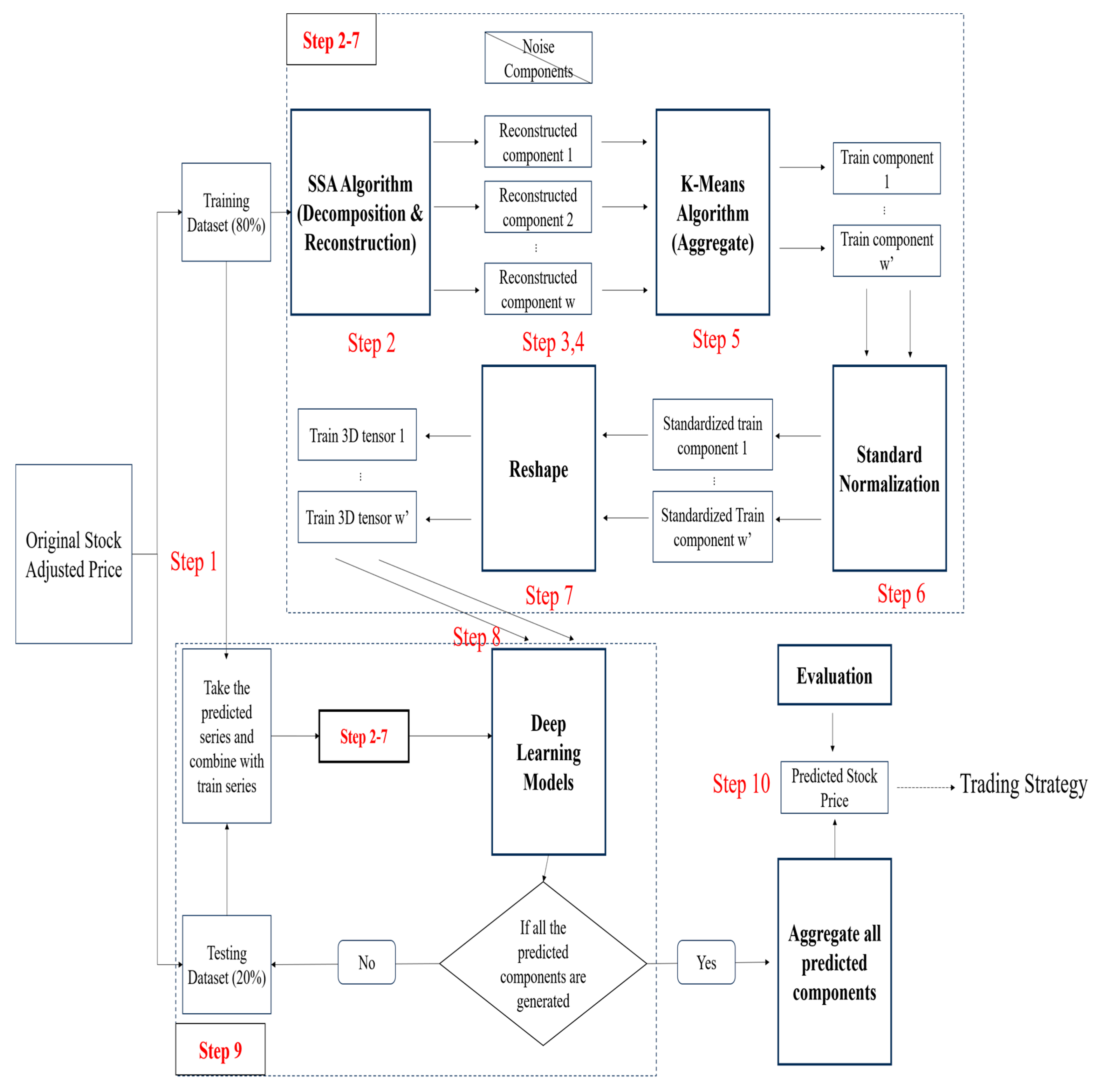 The proposed methodology follows a systematic and structured process. First, the Singular Spectrum Analysis (SSA) algorithm is applied separately to the training and test datasets to generate denoised time series. Second, these denoised training datasets are used to train multiple deep learning models, which are subsequently employed to forecast stock prices during the test period. Third, the predicted stock prices are aggregated and compared with the actual prices to evaluate each model’s forecasting performance. Finally, a trading strategy is developed based on the predicted prices to assess the practical utility and profitability of the proposed SSA-deep learning (SSA-DL) framework.