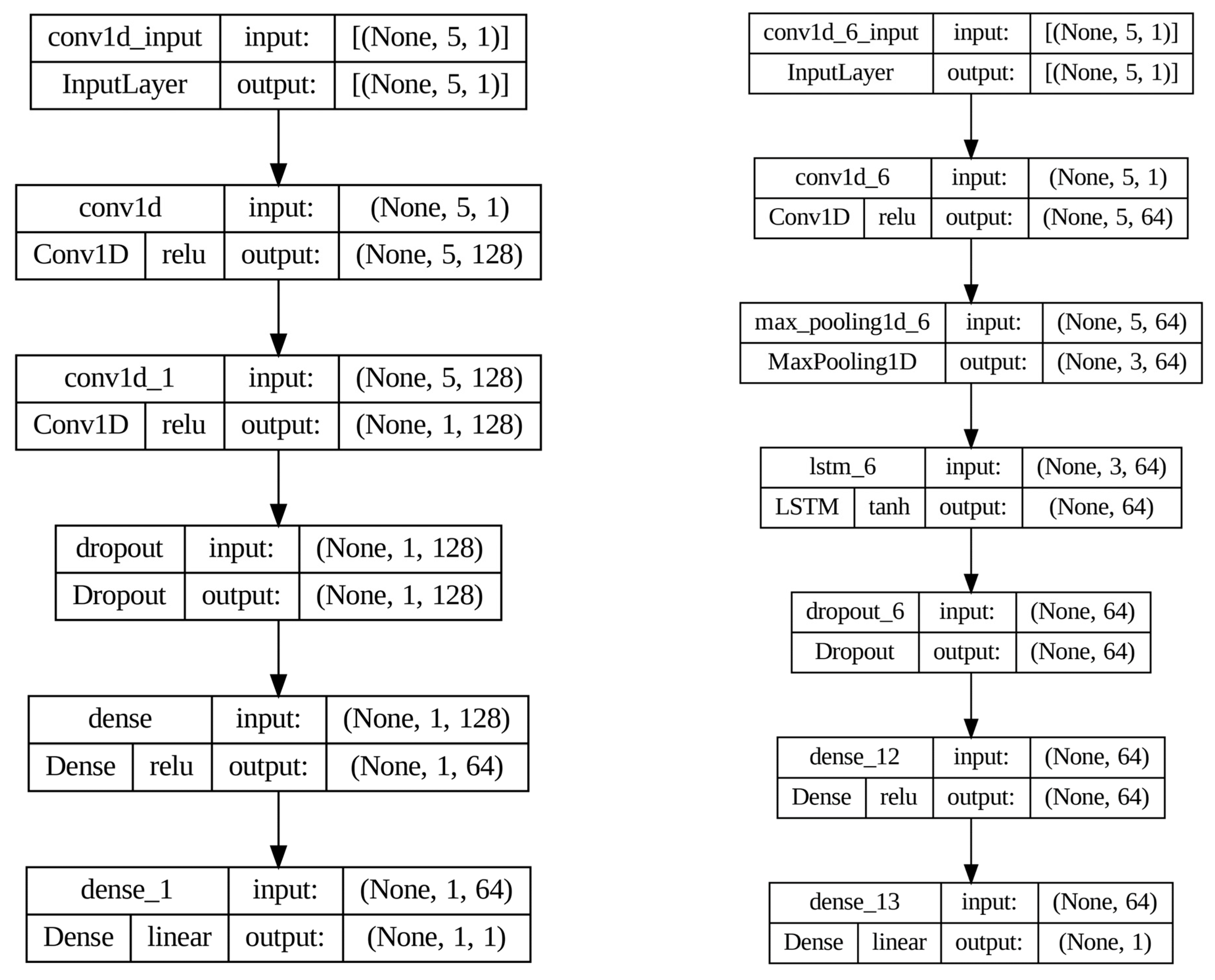 Figure 4 (right), integrates both convolutional and recurrent layers to leverage spatial and temporal features. The model starts with a convolutional layer consisting of 64 filters and a ReLU activation function, which extracts local spatial patterns from the input sequence. This is followed by a Max Pooling layer to down sample and highlight the most salient features. The resulting feature maps are then passed into an LSTM layer with 64 units and a tanh activation function, designed to capture the temporal dependencies within the sequence. The final prediction is generated through a dense layer with 64 neurons and ReLU activation.