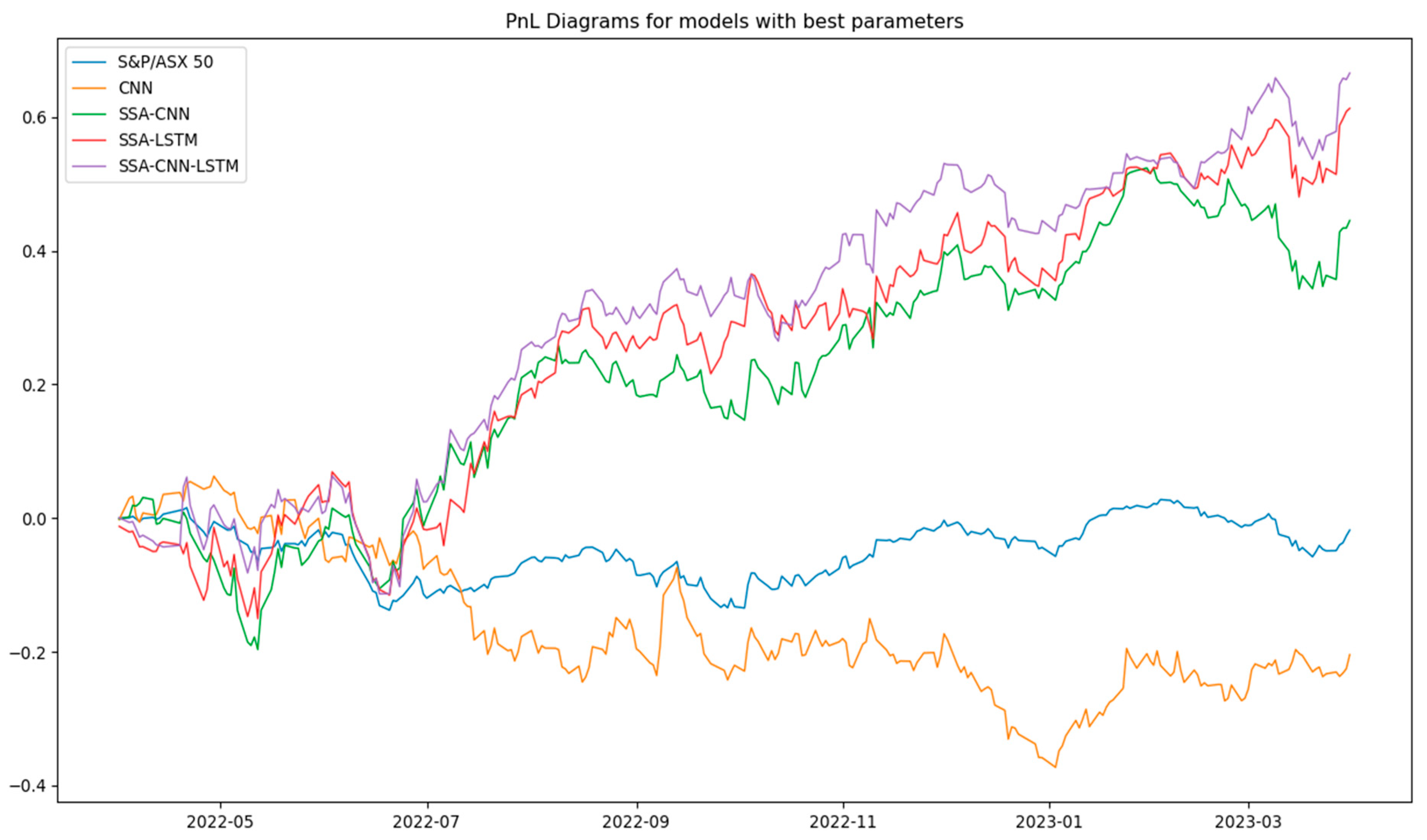 Figure 5 presents the PnL (Profit and Loss) curves for CNN and the best-performing models from each SSA-DL variant, compared with the S&P/ASX50 index [