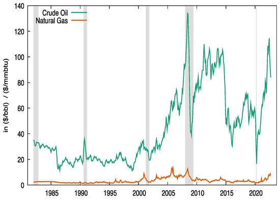 Monthly crude oil (Crude oil, US, West Texas Intermediate (WTI) 40’ API) and natural gas prices (Natural Gas (U.S.), spot price at Henry Hub, Louisiana), January 1982–September 2022. Source: World Bank data, author’s elaboration.
