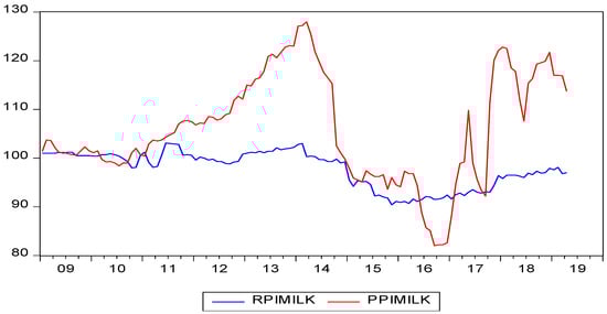The UK has an oligopolistic milk market, with 40% of liquid milk sales moving through the top four retailers [15]. This provides the large retailers bargaining power over dairy producers, reducing prices for dairy producers supplying retailer milk contracts [16]. As shown in Figure 1, secondary data from the Agriculture and Horticulture Development Board (AHDB) will be used to examine price transmission in the UK liquid milk market. Monthly retailer (RPIMILK) and producer (PPIMILK) price index data was collected from January 2009 to October 2019, totaling 121 observations.