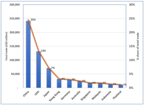 Thus, this article attempts to expand the literature by studying the asymmetric effect that the price of crude oil has on Korea’s exports and imports within the framework of bilateral trade between Korea and its three largest partners, controlling for world trade policy uncertainty. Starting from the early 1960s, Korea has embraced a growth strategy centered around export-oriented industries, with a primary focus on energy-intensive heavy industries. As a result, Korea has emerged as one of the world’s leading exporters, ranking among the top 7 globally, and has achieved a position within the top 10 economies worldwide. As of 2022, Korea’s three largest partners are China, the United States, and Japan, and constitute about 45% of Korea’s overall trade (Figure 1). Additionally, Korea’s reliance on crude oil imports currently reaches more than 50% to meet its energy demand. Thus, it is interesting from a policy and an empirical standpoint to probe to what extent oil price fluctuations have influenced Korea’s trade flows with its three largest partners (Figure 2). To this purpose, Shin et al.’s [1] approach, known as a nonlinear autoregressive distributed lag (NARDL) method, is applied. A notable advantage of employing the NARDL method is its applicability irrespective of whether the series are I(0) or I(1). By doing so, this method essentially eliminates the need for pre-unit root testing. Additionally, the NARDL model can be transformed into an error correction model (ECM) through a simple linear conversion. The ECM captures the short-term dynamics while imposing restrictions on the long-term equilibrium. Consequently, the NARDL model enables simultaneous estimation of both the short-term and long-term parameters in the model. Thus, the NARDL is considered a highly convenient tool for the current topic. In fact, the majority of the related studies have used the NARDL method when tackling the issue. However, Rafiq et al. [2] and Yalta and Yalta [3] have employed dynamic panel and rolling window methods to investigate the topic. The remaining sections provide the literature review, our model, empirical results, discussion, and conclusions with the data described in Appendix A.