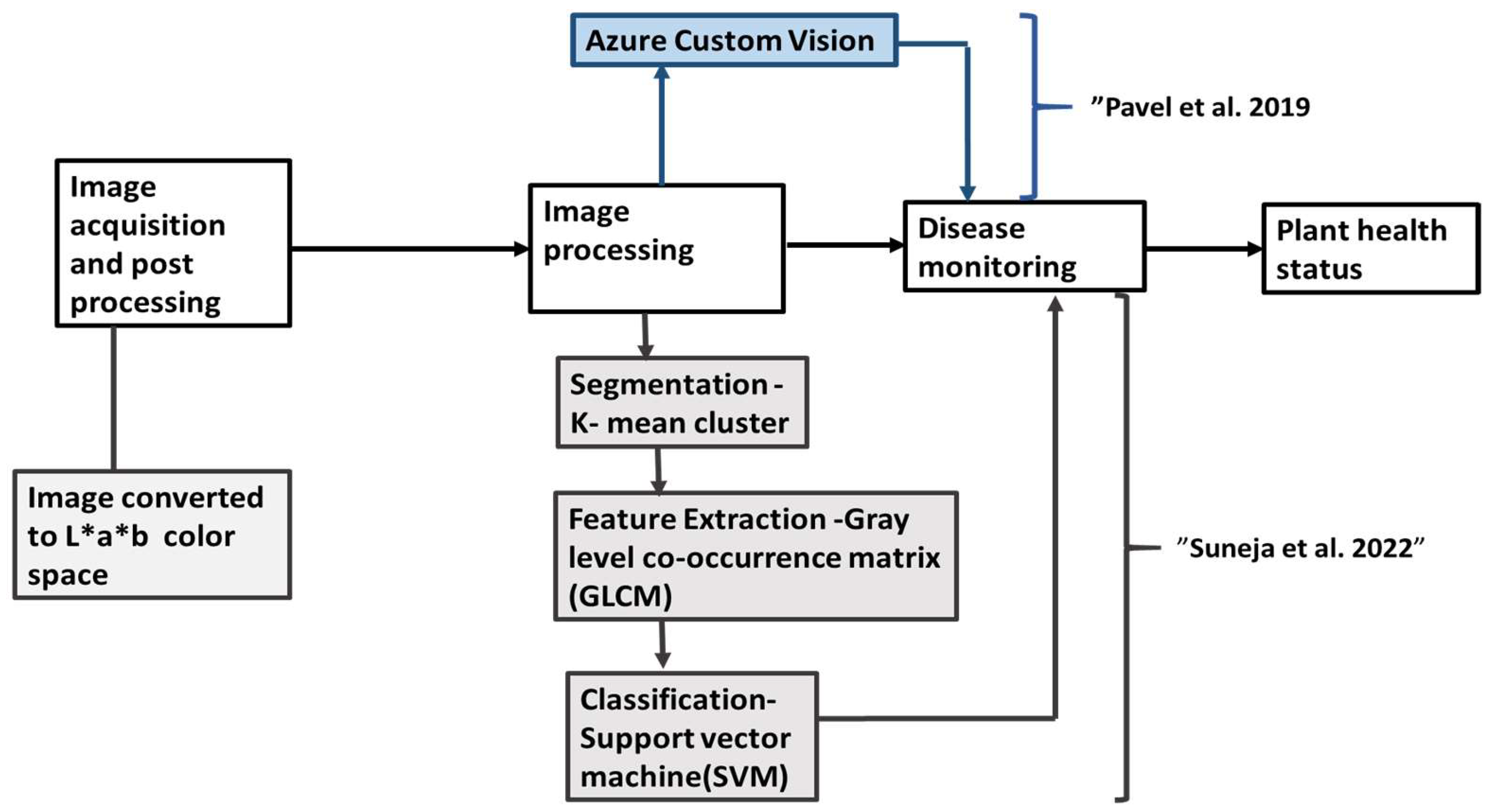 - Pavel, M.I.; Kamruzzaman, S.M.; Hasan, S.S.; Sabuj, S.R. An IoT based plant health monitoring system implementing image processing. In Proceedings of the 2019 IEEE 4th International Conference on Computer and Communication Systems, ICCCS 2019, Singapore, 23–25 February 2019; pp. 299–303. [Google Scholar]