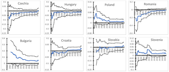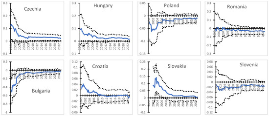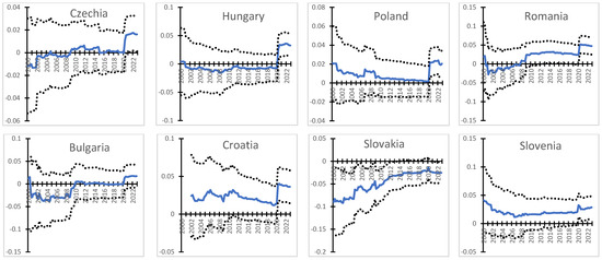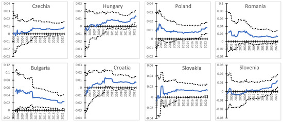 Among estimates of the fixed coefficients, openness is a factor behind higher inflation in Croatia and disinflation in Slovakia, while the output effects are unambiguously positive in Czechia, Hungary, Croatia, and Slovenia (results are available on request). An increase in the US long-term rate is inflationary in Romania, Bulgaria, Slovakia, and Slovenia. For Bulgaria, it is combined with an expansionary effect on output growth. A similar positive relationship between the US long-term rate and output growth is found in Czechia, with a negative link between and in Hungary (in both countries, estimated coefficients are statistically significant at the 10% level). Investments are complementary to economic growth in Poland and Bulgaria. Crisis developments of 2008–2009 and 2020–2021 have been deflationary in Czechia and Poland, with a contractionary impact on output growth in Hungary, Poland, Romania, and Slovakia.