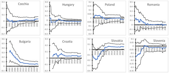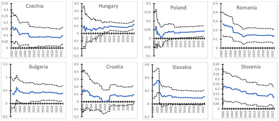 Finally, the NEER effects on inflation and output growth are presented in Figure 8 and Figure 9, respectively. A stable ERPT has been found for Czechia and Romania, but the estimates are low (Figure 8). For Hungary and Poland, the estimates of the ERPT are insignificant for the earlier pre-crisis period of 2000–2008, but it has been positive since then. The ERPT seems to be quite strong and stable in Bulgaria, implying that an exchange rate depreciation of 1% contributes to the acceleration of inflation by 0.4 percentage points. The ERPT of similar magnitude was observed in Slovakia over the 2000–2002 period, but it declined significantly in 2003, with relative stability at 0.1 since then and a slight increase in 2022 (like Hungary). For Slovenia, a downward trend in the ERPT is found throughout the 2000–2022 period, with local increases in 2010, 2014–2015, and again in 2020–2021. As of the end of 2022, the ERPT has decreased to a record low level. There is no evidence of the pass-through in Croatia till 2012. The relationship between exchange rate and inflation strengthened since then, but it is still statistically not significant.