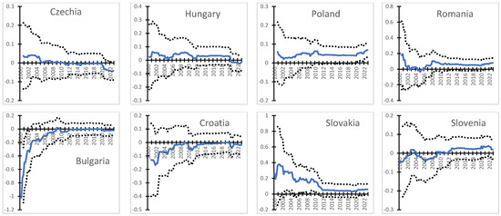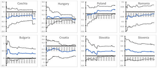 If we consider control for a few commodity prices, the exchange rate depreciation turns out to be expansionary in Bulgaria and Slovakia (Figure 9). The exchange rate effect on output growth is stronger for the former, with a somewhat lower statistical significance in the 2003–2008 period. As of the latter, the impact of on had been on a decline throughout the 2002–2008 period, but the trend reversed on the euro area adoption in 2009. In contrast, Croatia demonstrates that a relatively stable inverse relationship between the exchange rate and output growth emerged around 2010, though with signs of weakening since 2020. No exchange rate effects on output growth are found in Slovenia, Hungary, and Romania. Similar neutrality of the exchange rate with respect to output growth was observed in Czechia till the middle of 2020, but the effect has been contractionary since then.