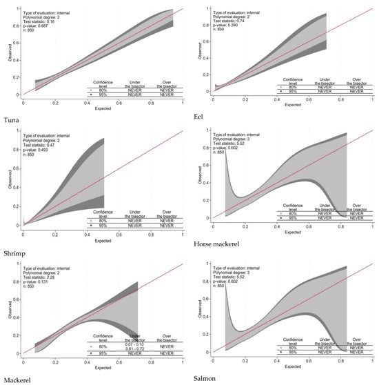 Finally, to test the goodness of fit of the binary logit models presented in Table 8, we conducted a calibration test developed by Nattino et al. [25]. The results of the calibration test in Figure 1 show that the null hypothesis of good calibration was not rejected at the 5% significance level, suggesting that all the linear logit models applied to the different types of fish were robust.