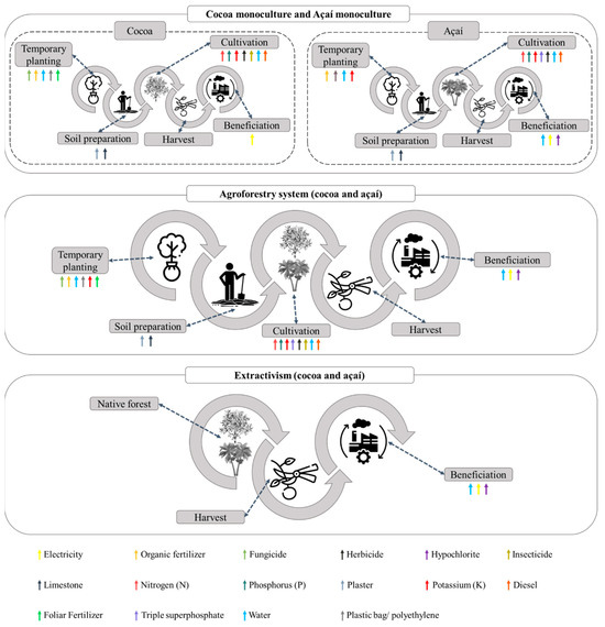The main objective of applying E-LCA was to evaluate the carbon footprint of perennial açaí (Euterpe oleracea) and cocoa (Theobroma cacao) crops in the Amazon Biome in monoculture, agroforestry, and native forest scenarios. Data collection for theoretical evaluation was substantiated by data consolidated by classic bibliographic references.