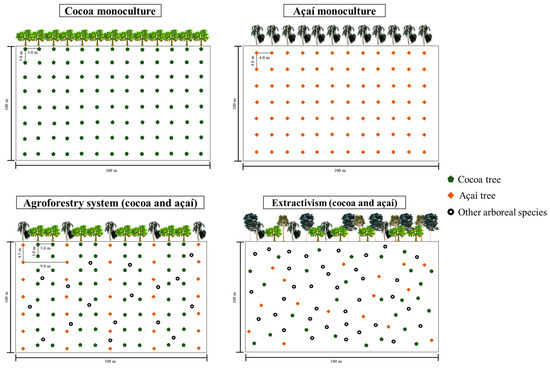 Schematic diagram of the spatial arrangements of Cocoa monoculture, Açaí monoculture, Agroforestry (cocoa and açaí), and Extractivism (cocoa and açaí).