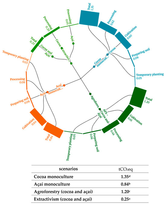 On the other hand, among the monoculture systems evaluated, the highest tCO2eq emissions were for cocoa monoculture. Temporary planting, soil preparation, cultivation, and processing of cocoa contributed 1.59 times more emissions than those of açaí [57]. This can be attributed in part to the disparity in tree density between cocoa and açaí, requiring greater use of agrochemicals to support the cocoa monoculture system. Evidently, in the context of monocultures, the choice of açaí appears to be the best option for the environment and also for reforesting areas in the biome. Furthermore, among all scenarios, it is the second-best option in terms of greenhouse gas emissions, after extractivism.