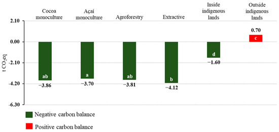 As illustrated in Figure 4, the carbon balance indicates negative values for cocoa monocultures, açaí monocultures, agroforestry, extractivism, and areas located inside indigenous lands. On the other hand, outside indigenous lands, it presented a positive value (0.70 tCO2eq), evidencing the significant influence of the territorial context on carbon capture. Among these systems, extractivism stands out with the greatest potential for carbon sequestration (−4.12 tCO2eq), followed by cocoa monoculture (−3.86 tCO2eq), agroforestry (−3.81 tCO2eq), and açaí monoculture (−3.70 tCO2eq), indicating the capacity to function as effective carbon sinks. However, it is important to note that these differences are not all statistically significant, especially among cocoa monoculture, agroforestry, and açaí monoculture, which share overlapping groupings. The difference observed between forest areas inside and outside Indigenous lands, where traditional management practices promote more efficient carbon carbon, highlights the effective-ness of these approaches in mitigating carbon dioxide emissions. And outside indigenous lands, it demonstrates that changes in unsustainable management practices, such as the adoption of intensive cultivation systems, can increase emissions.