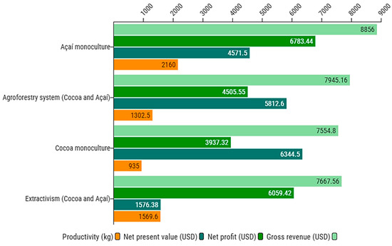 Furthermore, balancing economic sustainability is crucial, especially in regional development con-texts. In this sense, Figure 5 presents the values of gross revenue, net profit, net pre-sent value and productivity for the production systems. The highest gross revenue obtained, within the developed systems, was for the açaí monoculture USD 8856/ha and the lowest for the cocoa monoculture USD 7554.8/ha. For net profit, the values were USD 6783.44/ha for the açaí monoculture, USD 6059.42/ha for extractivism, USD 4505.55/ha in agroforestry and USD 3937.32/ha for cocoa monoculture. In the results, the NPV of all the production systems analyzed were positive. Regarding productivity, cocoa, and açaí monocultures had productivity of around 935 kg/ha of cocoa beans and 2160 kg/ha of frozen açaí pulp. For the agroforestry system, it was around 654.5 kg/ha of cocoa beans and 648 kg/ha of açaí pulp, while in the ex-tractive systems, it was 309.6 kg/ha of cocoa beans and 1260 kg/ha of açaí pulp. These differences are mainly due to the higher density of productive trees per hectare in monoculture systems, compared to agroforestry and extractive systems. Productivity values refer to processed forms—cocoa beans (after fermentation and drying) and frozen açaí pulp (after pulping). This distinction ensures consistency between productivity and emissions. Differences may also reflect product density and harvesting systems (tree vs. palm), which influence yield and efficiency.