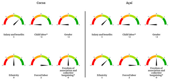 Classification of the social life cycle analysis of cocoa and açaí commodities present in the northern region of Brazil. +2: Ideal compliance; +1: Above basic compliance; 0: Within basic compliance by local and international laws; −1: Below basic compliance; −2: Does not meet basic compliance. * Corresponds to data from the primary sector, covering all activities related to monocultures, agroforestry systems, and extractivism of the biome.