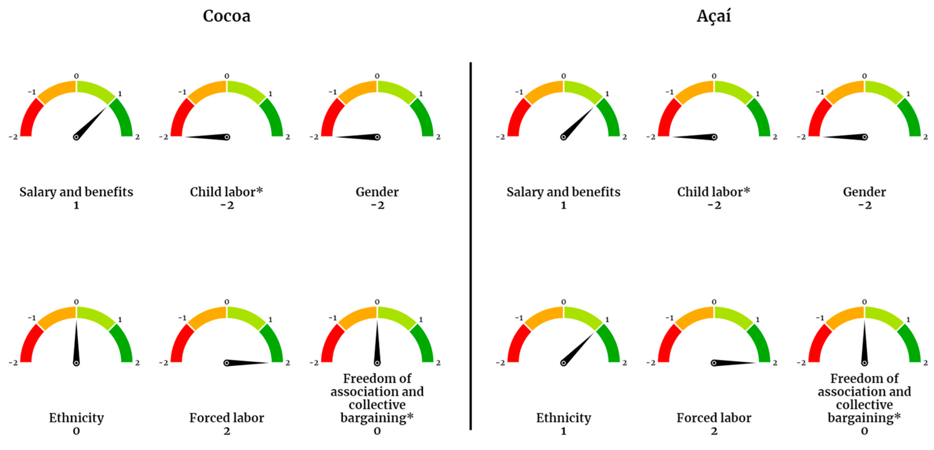 As for the child labor subcategory, alarmingly, it is among the two worst subcategories evaluated in the study, allocated on the worst scale (−2). In Brazil, the Federal Constitution establishes the prohibition of work for children under 16 years of age, except as apprentices from the age of 14. The 2022 Continuous National Household Sample Survey indicates that 4.9% of children and adolescents, between 5 and 17 years of age, were in a situation of child labor, totaling 1.9 million young people [49]. It is worth highlighting that the agricultural sector, including the production of cocoa and açaí, is one of the main responsible for this practice, making these products socially unsustainable. Therefore, there may be a very high risk that much of the chocolate purchased and consumed globally may have been produced using child labor.