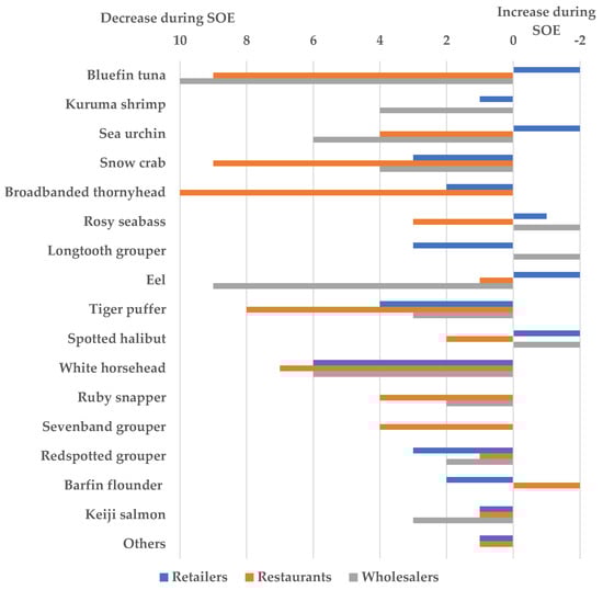 Most of these species experienced a decline in trading volume during the state of emergencies (SOEs). However, among retailers, the trading volume of bluefin tuna, sea urchin, rosy seabass, eel, and spotted halibut increased. Similarly, wholesalers saw an increase in the volume of rosy seabass, longtooth grouper, red spotted grouper, and spotted halibut. In contrast, the restaurant market experienced a significant decline in trading volume for all species except barfin flounder, which saw an increase.