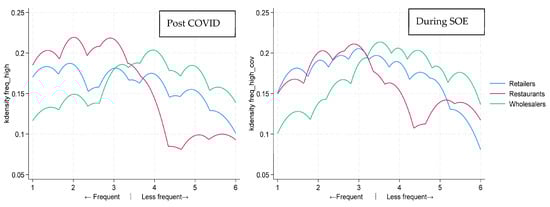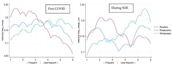 Figure 4 show the kernel density distribution of the purchase frequency of luxury and inexpensive seafood products across business categories, comparing the post-COVID period with the SOE period. A value of less than 3 indicates more frequent purchases, while a value of greater than 3 indicates less frequent purchases. Specifically: 1: purchases seafood more than five times per week, 2: purchases seafood three to four times per week, 3: purchases seafood two to three times per week, 4: purchases seafood once per week, 5: purchases seafood several times per month, and 6: purchases seafood less than once per month.