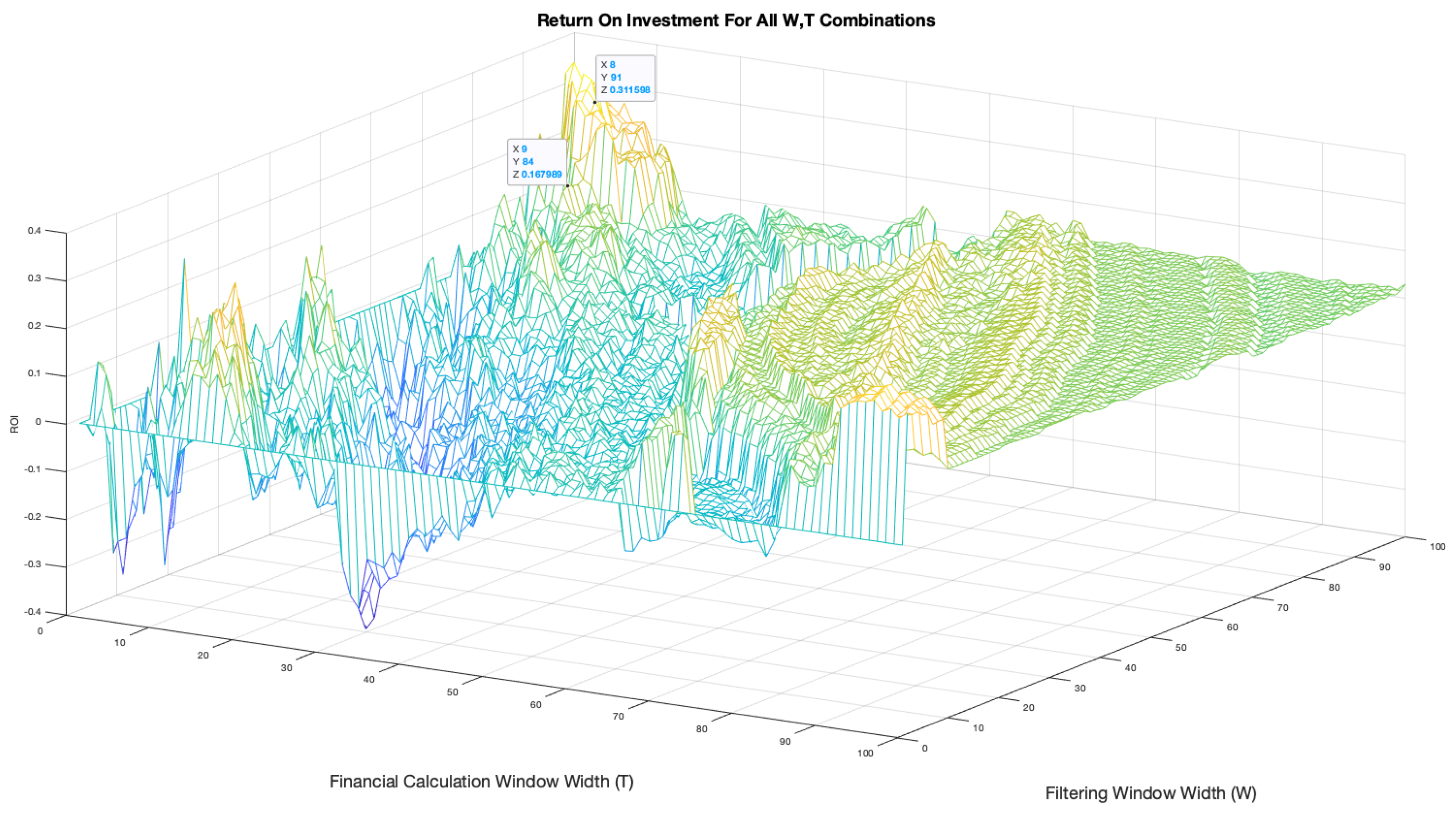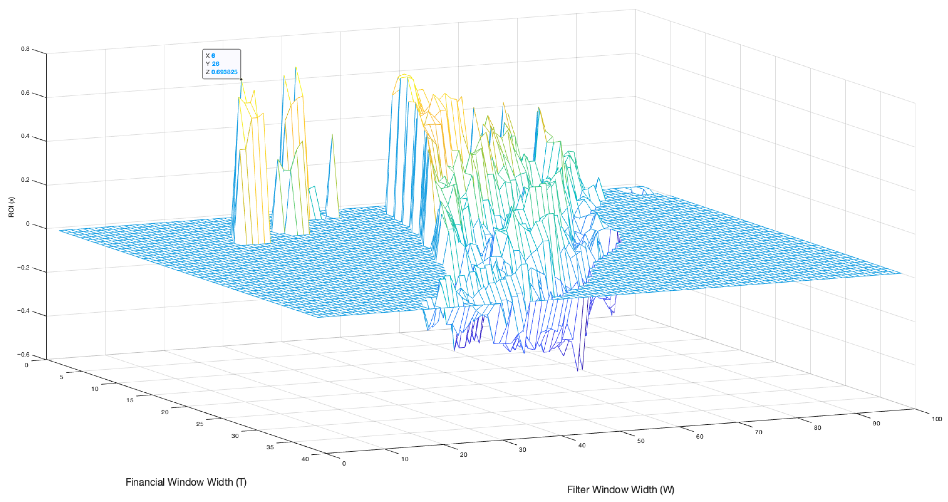Parameter sweep analysis provided a basis for selecting optimal parameter values. Filter window sizes must be minimised to reduce trading delays while still removing noise to ensure accurate system outputs. For a given range of filter widths (W), the window length (T) should satisfy . This parameter selection rule was shown to yield high accuracy and profitable returns. Short time steps produce time series with elevated noise levels, reducing trend prediction accuracy and increasing susceptibility to micro-trends, which can lead to positions that incur losses. Consequently, a combination of long- and short-term analyses is recommended, where short-term results identify the most opportune moments to enter positions as guided by the associated long-term trends.