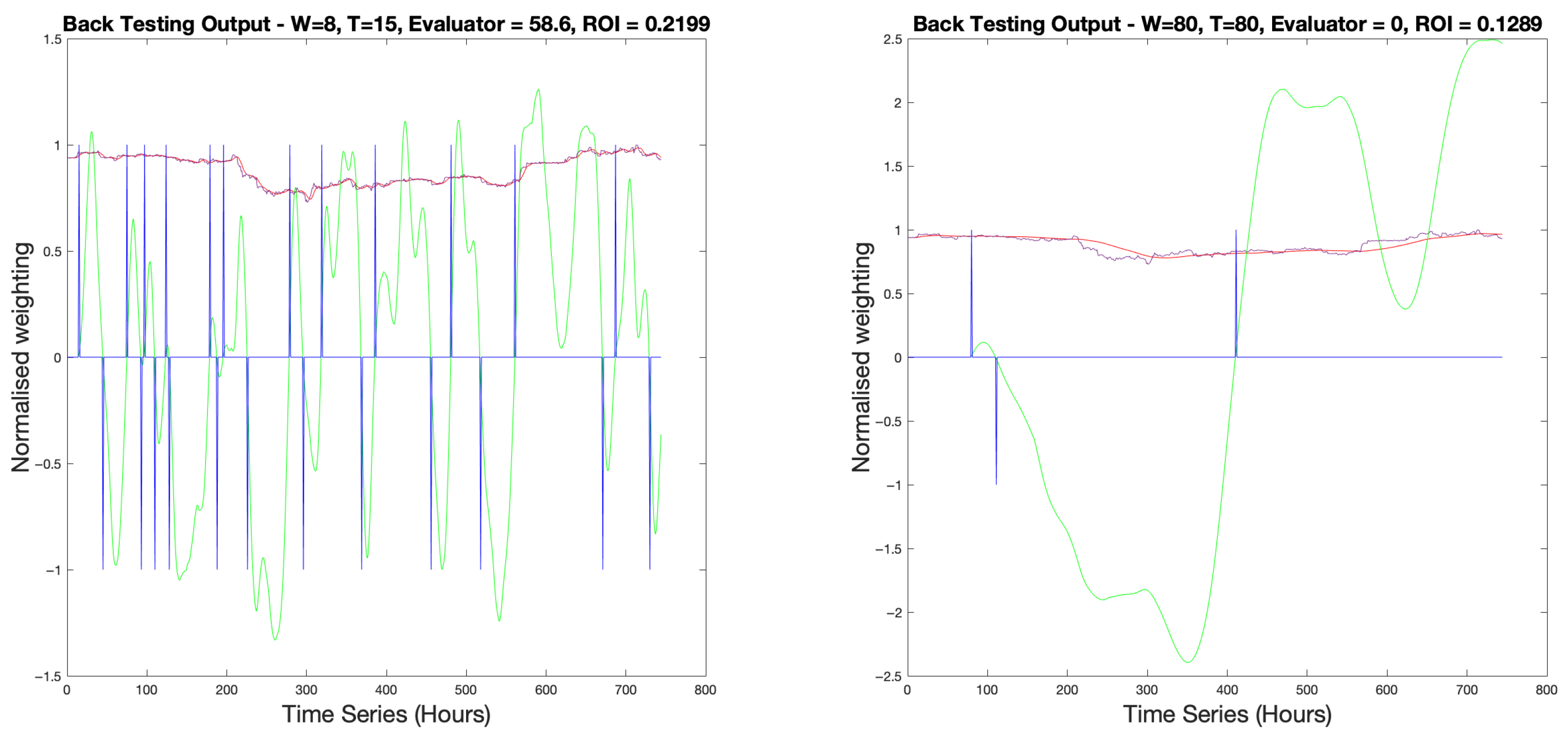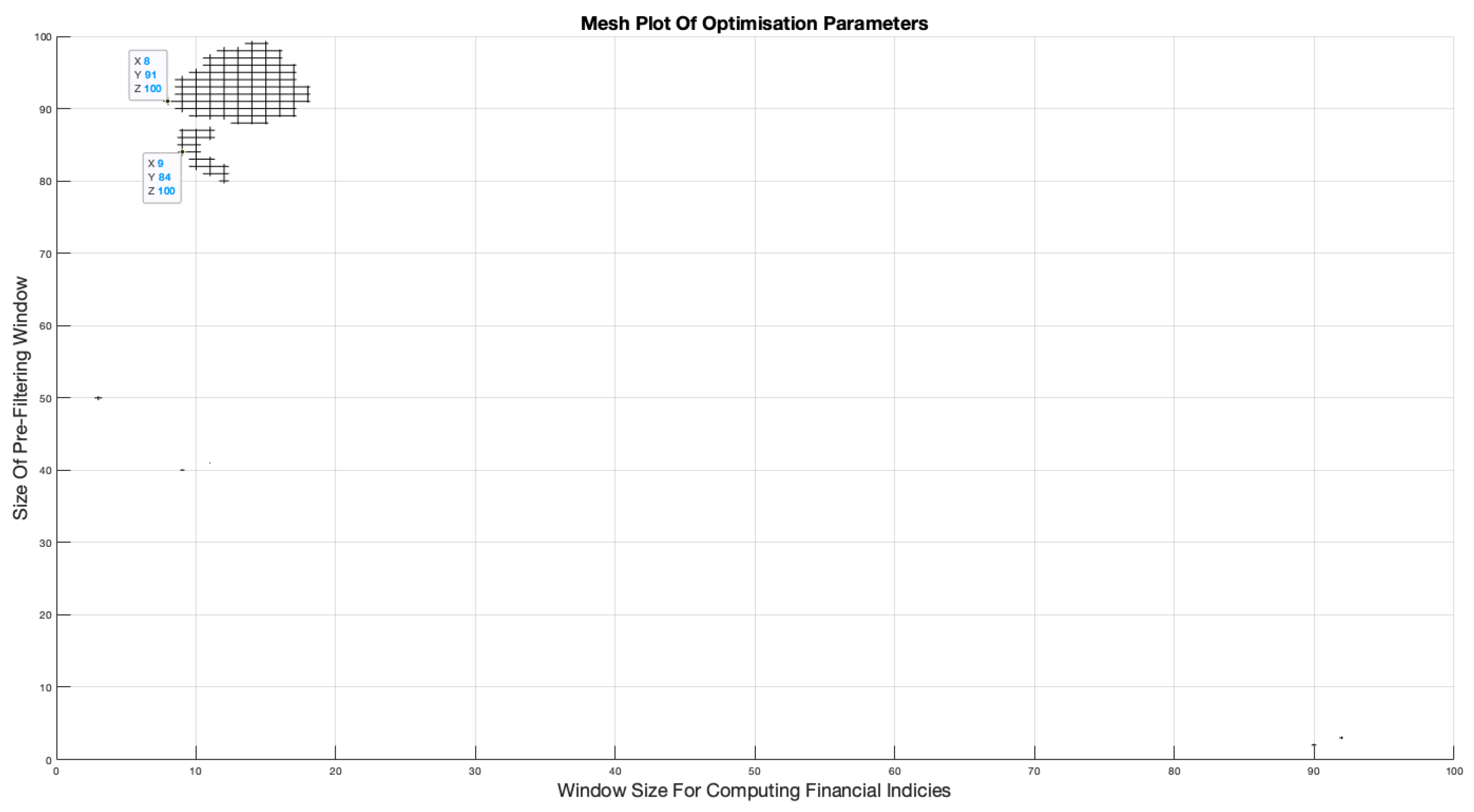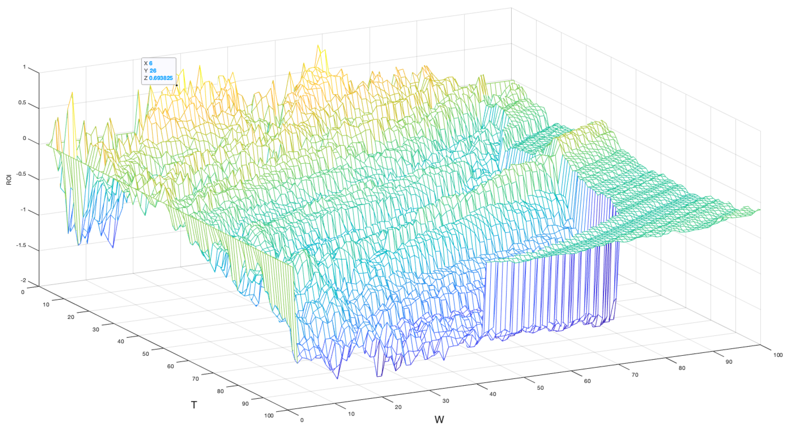 During backtesting and optimisation, a range of ideal values for the W, T parameters was alluded to. The need to reduce trading delay, whilst minimising the noise in the signal, proved to be dependent on the time scale of the time series, with larger filtering windows being required for the more detailed hourly data fields. Financial calculations had to be undertaken over small time windows relative to the length of data being analysed, whilst staying above the limit of 2. Unlike W, T values did not increase with an increase in scaling. Observing the positions, the location of the GOC can be acquired. This is related to the smallest range of W values for which T is minimised. This GOC was consistent, through all fields of the same currency and scale, leading to the guidelines for the parameter choice as follows: W—Smallest values for which noise is sufficiently removed; T—. Although this range, for the two parameters, did not always result in the most profitable trades, the high accuracy allowed high confidence in a profitable strategy. The fluctuation in ROI for neighbouring combinations can be explained by rapid micro-trends making an ‘ideal’ position recommendation impossible given the level of trading delay.