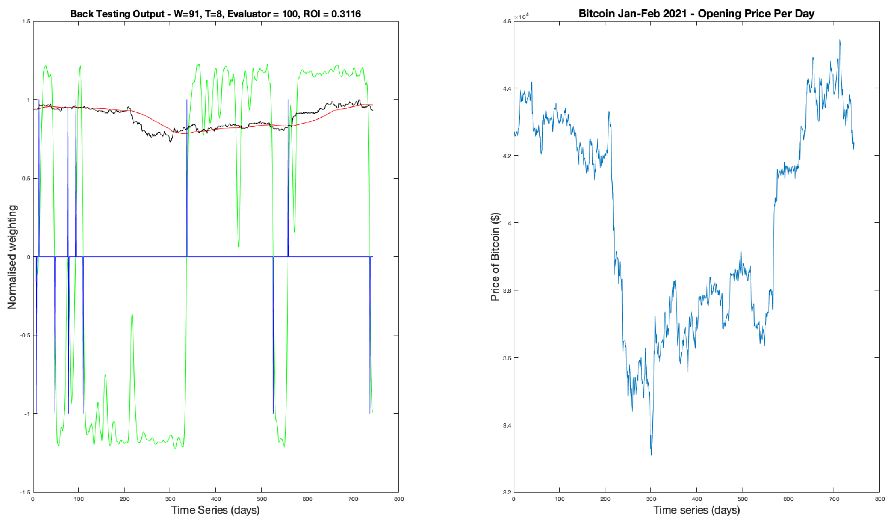 The hourly data (right) shows a number of trades being recommended with a return over a period of overall loss in value. This is in stark contrast to the daily backtest, which showed no positions, therefore resulting in a loss. The most interesting comparison, is the opposite trade positions recommended for the last few data points, with daily data suggesting a purchase and hourly data suggesting a short market position.