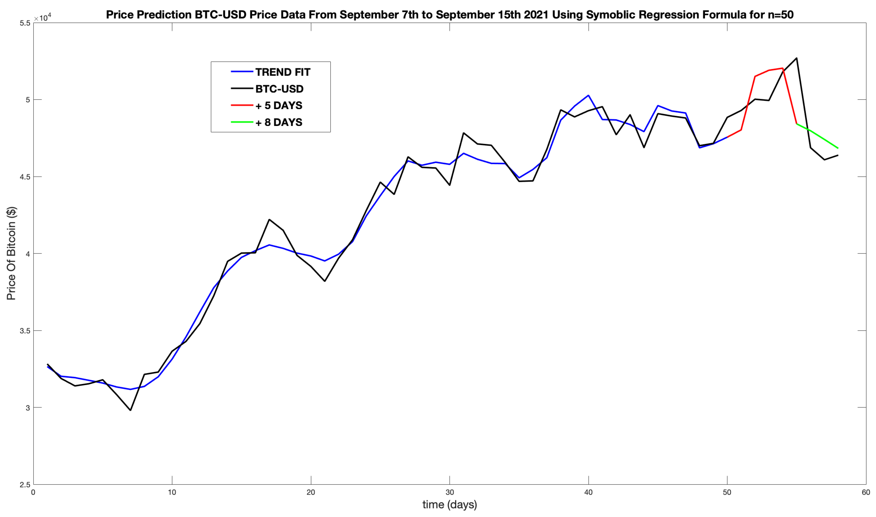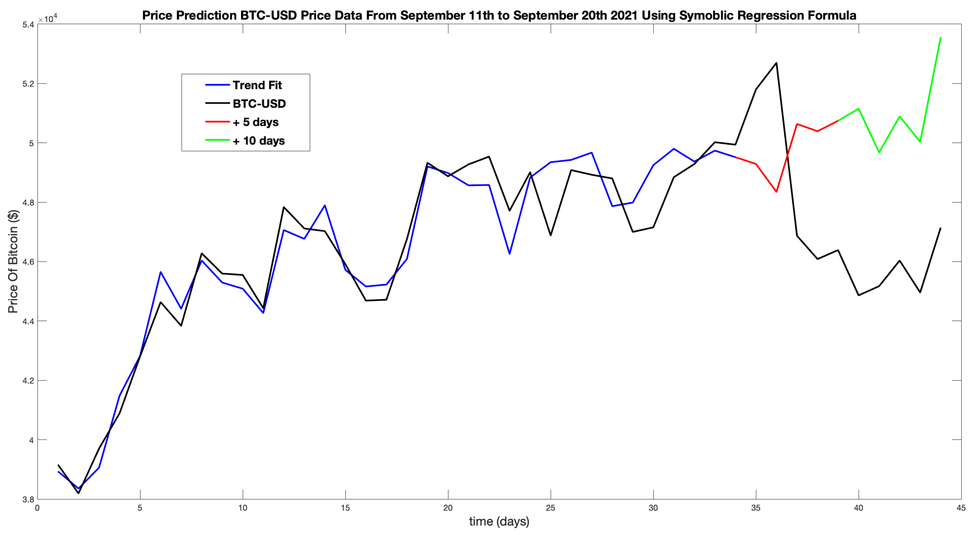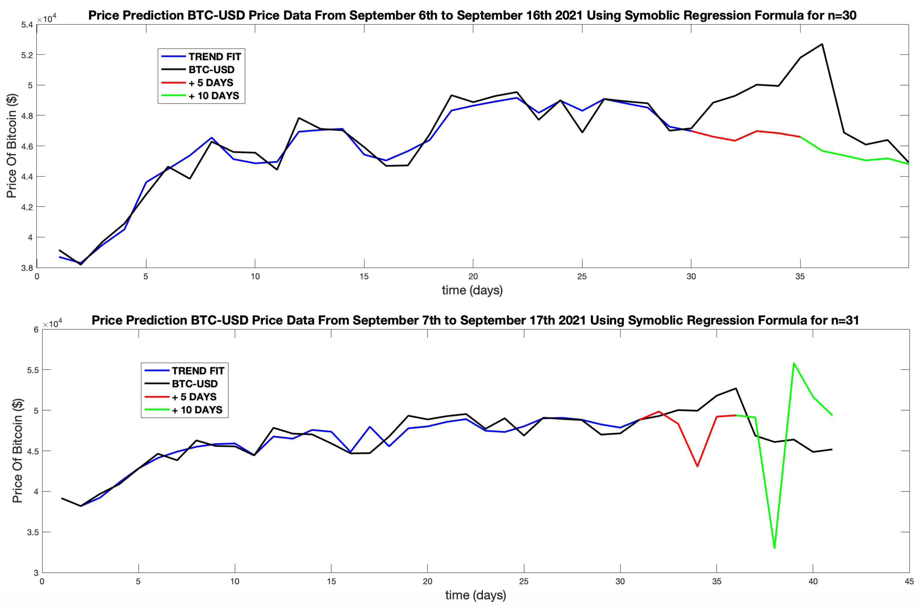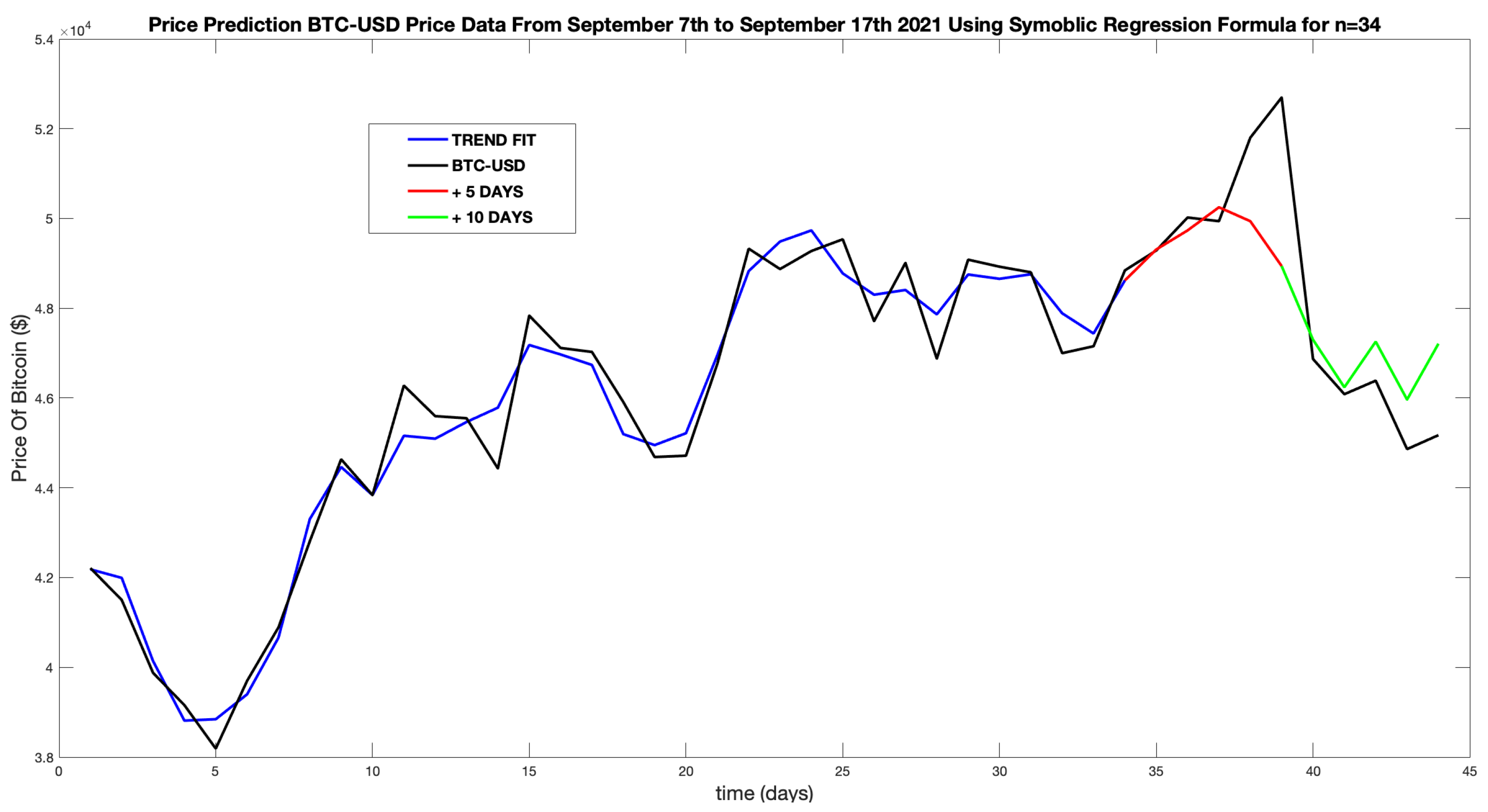 Figure 25 shows the actual BTC-USD price data from 21 August to 20 September in black, the trend ‘fit’ for historical data up to 10 September, shown in blue, and then future estimated prices for +5 days to 15 September in red and +10 to 20 September in green. Each price estimation figure will use the same format.