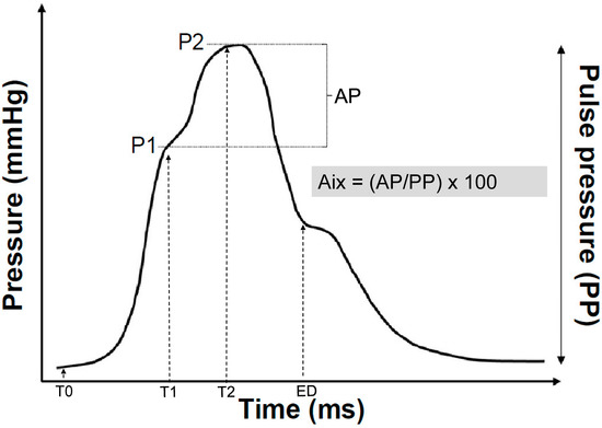 Subjects had to rest for 10 min in a supine position before the pulse wave analysis maneuver was performed. Afterwards, radial artery pulse waveforms were recorded using the SphygmoCor System (AtCor Medical, Sydney, NSW, Australia). Approximately 10 radial pulse waves were measured to generate a corresponding central aortic pressure waveform by using a validated mathematical transfer function [21]. The inflection point of the aortic pressure waveform was determined using an algorithm that divides the aortic pressure wave into an early and late systolic peak and corresponds to the onset of the reflected wave returning from the peripheral arteries (Figure 1).