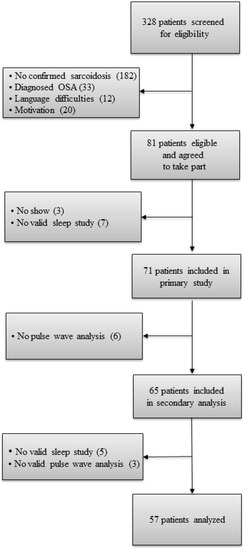A total of 65 sarcoidosis patients underwent pulse wave analysis measurements. Because of an insufficient measurement quality, three sarcoidosis patients had to be excluded. Five sarcoidosis patients were excluded due to missing sleep studies. A total of 57 subjects entered the final analysis (Figure 2).