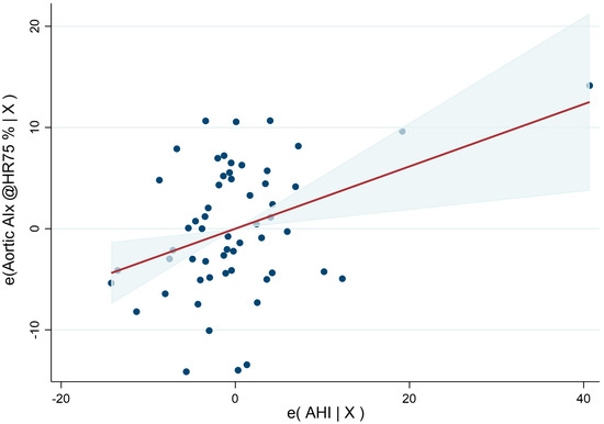 Added-variable plot with a 95% confidence interval between the aortic augmentation index (AIx) and apnea–hypopnea index (AHI) to display the relationship between AIx and AHI in the multivariable regression model. A higher AHI is associated with a higher Aix, while the adjusted variables (age, sex, height, systolic blood pressure, smoker, antihypertensive drug, and steroids) remained constant (Coef. 0.31, p = 0.006).