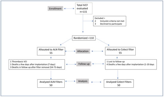 The main objective of this study was to compare two IVCFs available in our centers. For this purpose, a randomized study of the Celect and ALN filters was carried out in relation to efficacy at twelve months, safety (major complications), and filter recoverability.