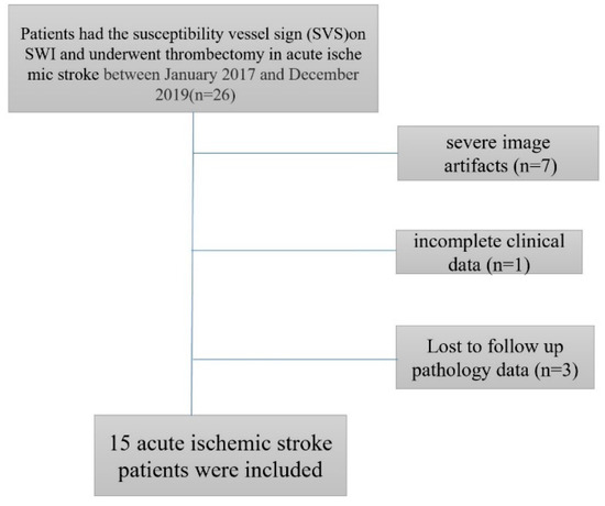 This retrospective study was approved by the local institutional review board of Shanghai Fourth People’s Hospital Affiliated with Tongji University, School of Medicine, Shanghai, China. Written informed consent was obtained from the patients or their relatives between October 2017 and December 2019 and stored in the hospital database. A total of 26 patients were registered during the study period. Of them, 11 patients were excluded because of severe image artifacts (n = 7), incomplete clinical data (n = 1), and pathology data (n = 3), leaving 15 patients in the current analysis (Figure 1). Digital subtraction angiography (DSA) was used to confirm the diagnosis of MCA occlusion before thrombectomy. The clinical information on parameters, including age, gender, time from symptom onset to magnetic resonance imaging (MRI) examination, National Institute of Health Stroke Scale (NIHSS) score, 90-day mRS, and clinical history, was obtained from our stroke unit registry and electronic medical records.