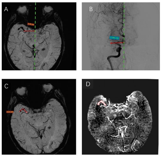 The location of the SVS was used to denote the position of the thrombus in relation to the midline. The midline was defined as a line connecting the occipital part of the superior sagittal sinus with the point midway between the A2 segments of the anterior cerebral arteries, as observed on axial images. The maximum thrombus length was measured on SWI using a previously published method [17]. The diagnostic series of DSA images were analyzed for the presence and location of the occluding thrombus according to the criteria used for SWI. The detailed measurements are shown in Figure 3A–C. The measurements were completed by two radiologists unaware of SVS on SWI and the location of the occlusion on SWI and DSA.