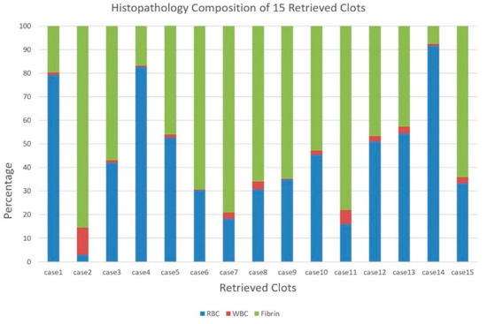 The thrombi were automatically categorized into RBC-dominant and fibrin-dominant thrombi based on the microscopic features. The mean proportions in 15 retrieved thrombi were as follows: fibrin 53.1%, RBCs 44.4%, and WBCs 2.5%. The pathology was broadly distributed across all cases, as shown in Figure 4.