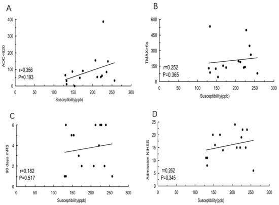 The point-and-figure charts of the correlations between thrombus susceptibility and ADC < 620 mm2/s volume map, Tmax > 6 s volume map, 90 days mRS, admission NIHSS. (A) The susceptibility was weakly negatively correlated with ADC < 620 mm2/s volume map (r = 0.356, p = 0.193). (B) The susceptibility was poorly correlated with Tmax > 6 s volume map (r = 0.252, p = 0.365), (C) 90-day mRS (r = 0.182, p = 0.517), and (D) NIHSS at admission (r = 0.262, p = 0.345).