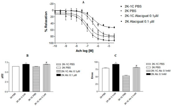 Concentration-effect curves for acetylcholine (Ach) were generated in aortic rings with intact endothelium (responsive to Ach), and precontracted with phenylephrine, in both 2K and 2K-1C Wistar rats. (A) The values are the means ± S.E.M. They are expressed as a percentage of relaxation on preparations obtained from different animals 2K-1C and 2K. (B) Bars represent the potency (pD2) of acetylcholine obtained from concentration-effect curves of different 2K-1C and 2K animals. The * indicates difference (p < 0.01) in pD2 from 2K Atc 0.1 µM (n = 6) vs. 2K PBS (n = 6). # indicates difference (p < 0.01) in pD2 from 2K-1C Atc 0.1µ M (n = 6) vs. 2K-1C PBS (n = 6). (C) Bars represent the maximum effect (Emax) of acetylcholine obtained from concentration-effect curves of different 2K-1C and 2K animals. The * indicates a difference (p < 0.01) in Emax from 2K Atc 0.1µM (n = 6) vs. 2K PBS (n = 6). The # indicates a difference (p < 0.01) in Emax from 2K-1C Atc 0.1 µM (n = 6) vs. 2K-1C PBS (n = 6).