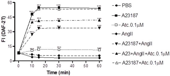- ▪ This technique enables the quantification of the intracellular concentration of NO, considering its short half-life. The measurements were carried out using the SpectraMax Gemini XS fluorometer (Molecular Devices, San Jose, CA, USA) with an excitation wavelength of 435 nm and an emission wavelength of 538 nm. Angiotensin II incubation was implemented to mimic endothelial dysfunction, while A23187 was utilized to induce an elevation in intracellular calcium, thereby activating NOS.