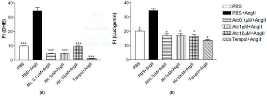 (A) Quantification of Reactivity Oxygen Species (ROS) in HUVEC. Values are means ± E.P.M fluorescence intensity obtained on HUVEC cells after a 30 min treatment with ataciguat, tempol and angiotensin II. The *** indicates difference between ataciguat 0.1 µM + angiotensin II vs. PBS + angiotensin II; ataciguat 1 µM + angiotensin II vs. PBS + angiotensin II; ataciguat 10 µM + angiotensin II vs. PBS + angiotensin II and tempol + angiotensin II vs. PBS + angiotensin II (p < 0.001). (B) Quantification of superoxide anions (O2−) in HUVEC. Values are means ± E.P.M fluorescence intensity obtained on HUVEC cells after a 30 min treatment with ataciguat, tempol and angiotensin II. * indicates the difference between PBS + angiotensin II vs. PBS; ataciguat 0.1 µM + angiotensin II vs. PBS + angiotensin II; ataciguat 1 µM + angiotensin II vs. PBS + angiotensin II; ataciguat 10 µM + angiotensin II vs. PBS + angiotensin II and tempol + angiotensin II vs. PBS + angiotensin II (p < 0.05).