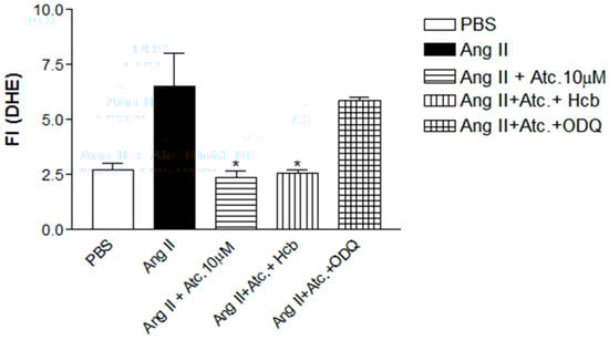 To investigate whether the ataciguat-induced reduction in ROS and superoxide is attributed to sGC activation and/or NO formation, experiments were conducted in the presence of hydroxocobalamin (NO scavenger) or ODQ (sGC inhibitor), as can be seen at Figure 4. In the presence of hydroxocobalamin, no alteration in the ataciguat effect was observed (Ang. II + ataciguat + Hcb: 2.56 ± 0.16, n = 5, p < 0.05), suggesting that the decrease in ROS induced by ataciguat is not dependent on NO production. However, sGC inhibition (ODQ) nullified the ataciguat effect (Ang. II + ataciguat + ODQ: 5.86 ± 0.14, n = 5, p < 0.05), indicating the involvement of sGC in the ataciguat effect (Figure 4).
