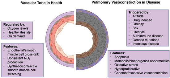 Figure 1. Schematic of healthy vascular tone compared to diseased pulmonary vasoconstriction. Several factors including lifestyle, oxygen levels, and infectious diseases can influence vascular tone. Features of healthy vascular tone include nitric oxide production, as well as cell cross-talk between endothelial, smooth muscle cells, and adventitial cells. Features of diseased pulmonary vasoconstriction include apoptosis, oxidative stress, and hyperproliferative cells.