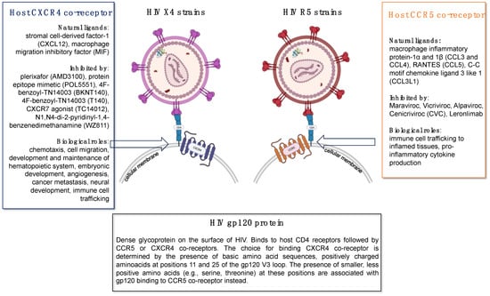 Figure 3. Diagram indicating HIV X4, which uses C-X-C chemokine receptor type 4 (CXCR4) and HIV R5, which uses C-C chemokine receptor type 5 (CCR5). Interactions with CXCR4 or CCR5 are determined by HIV-1 glycoprotein 120 (gp120).
