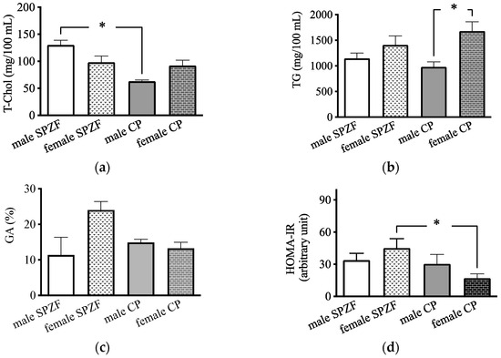 Serum T-Chol levels in the male CP group were significantly lower than those in the male SPZF group (Figure 1a), and serum TG levels in the female CP group were significantly higher than those in the male CP group (Figure 1b). There were no significant differences in the GA levels among the four groups (Figure 1c); however, the HOMA-IR in the female CP group was significantly lower than that in the other groups (Figure 1d).