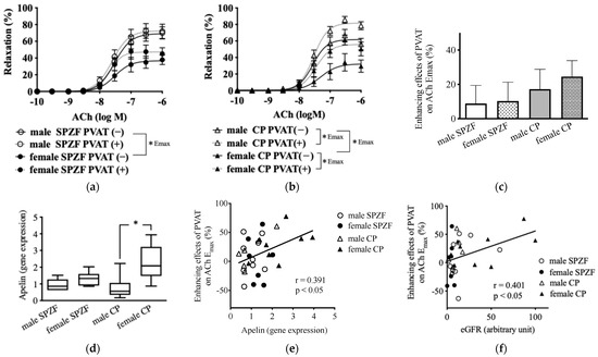 Vascular relaxation in response to acetylcholine (ACh) in renal arteries with [PVAT(+)] or without [PVAT(−)] perivascular adipose tissue (PVAT) (a,b), PVAT-related enhancement of vasorelaxation in renal arteries (c), mRNA expression of apelin in renal arterial PVAT (d), and correlations between enhancement of vasorelaxation and apelin (e) or estimated glomerular filtration rate (eGFR, (f)) in male and female SHRSP.Z-Leprfa/IzmDmcr (SPZF) rats and SHR/NDmcr-cp (CP) rats at 23 weeks of age (rats/group, n = 8). Enhancing effects of PVAT were assessed by differences in maximum response to acetylcholine (ACh) in renal arteries with or without PVAT. * p < 0.05. Data are expressed as means ± SEM. * p < 0.05. Statistical comparisons of means between groups were performed using one-way ANOVA followed by Bonferroni post hoc test. Reported data of (a,b) are reproduced from our previous publication in Biomolecules [22].