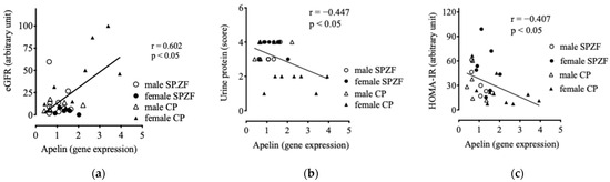 Correlations between mRNA expression of apelin in renal arterial perivascular adipose tissues (PVATs) and estimated glomerular filtration rate (eGFR, (a)), urine protein (b), and homeostasis model assessment of insulin resistance (HOMA-IR, (c)) in male and female SHRSP.Z-Leprfa/IzmDmcr (SHRSP.ZF) rats and SHR/NDmcr-cp (CP) rats at 23 weeks of age (rats/group, n = 8).