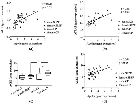 Correlations between mRNA expression of apelin and angiotensin II type 1 receptor (AT1R) (a), AT1R-associated protein (ATRAP, (b)), and angiotensin-converting enzyme 2 (ACE2, (d)), as well as mRNA expression of ACE 2 (c) in renal arterial perivascular adipose tissues (PVAT) in male and female SHRSP.Z-Leprfa/IzmDmcr (SPZF) rats and SHR/NDmcr-cp (CP) rats at 23 weeks of age (rats/group, n = 8). * P < 0.05. Statistical comparisons of means between groups were performed using one-way ANOVA followed by Bonferroni post hoc test.