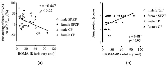 Correlations between homeostasis model assessment of insulin resistance (HOMA-IR) and enhancement of vasorelaxation by PVAT (a) and urine protein (b) in male and female SHRSP.Z-Leprfa/IzmDmcr (SPZF) rats and SHR/NDmcr-cp (CP) rats at 23 weeks of age (rats/group, n = 8). Enhancing effects of PVAT were assessed by differences in maximum response to acetylcholine (ACh) in renal arteries with or without PVAT.
