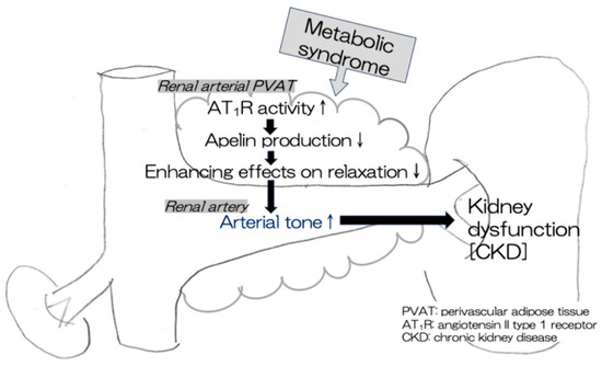 This study demonstrated that apelin levels in the renal arterial PVAT were positively correlated with the PVAT-enhancing effects on relaxation in renal arteries in rat models of human MetS (CP and SPZF rats). Furthermore, a high apelin level in the PVAT was related to a high eGFR level and a low urine protein level, which are indices of kidney function preservation. This study suggests that a high expression of apelin mRNA in the PVAT is needed to maintain the beneficial PVAT function (anti-contractile activity), resulting in the preservation of renal arterial tone and renal function. Apelin levels in the mesenteric arterial PVAT are associated with the alteration of the favorable vasorelaxation response by the PVAT in the mesenteric arteries of rats with MetS [25,27]. There may be no site-dependent differences in the mechanism by which the PVAT promotes the vasorelaxant response via apelin production/release. Additionally, we observed a positive correlation between apelin and either ACE2 or ATRAP levels, which are known as negative regulators of Ang II-related AT1R activity [23,26,33,34,35], in the renal arterial PVAT. Enhancement of Ang II-mediated AT1R activity in the PVAT probably involves a decrease in apelin expression, leading to the disappearance of the beneficial PVAT function induced by apelin in MetS (Figure 7).