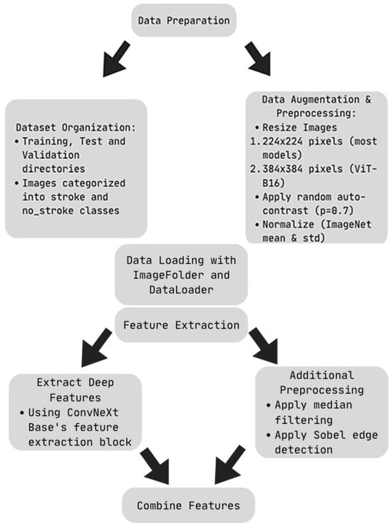 Stroke can be divided into two main types based on its cause: ischemic and hemorrhagic. An ischemic stroke occurs when a blood vessel in the brain becomes blocked, resulting in a lack of blood flow to a specific part of the brain. This can happen due to a blood clot (thrombosis), a piece of debris from the heart (cardio-embolism), a buildup of plaque in the arteries (atherosclerosis), or a blockage of many small arteries (platelets plug). In contrast, hemorrhagic stroke occurs when a blood vessel in the brain bursts, causing bleeding in the brain [1,2]. In the last 20 years, stroke has become a major cause of death and long-term disabilities worldwide. According to the World Health Organization, stroke accounts for about one in every ten cases of illness globally and is the second most common cause of death worldwide [3,4,5]. Stroke is a major health issue in Turkey. Out of every 100,000 people, about 93–109 experience ischemic strokes (caused by blood clots in the brain) and 32–40 have intracerebral hemorrhages (bleeding in the brain). This means that about 142–158 people per 100,000 have a stroke. The high number of strokes in Turkey shows how much of a problem it is. This means that we need to find ways to prevent and treat strokes to reduce the number of people who get sick or die from them [6,7]. In cases of stroke, the initial 6 h are critical for effective treatment. During this acute phase, prompt decision-making and timely interventions by healthcare professionals are crucial [8,9,10]. Advanced brain scanning methods like CT and MRI have become crucial for rapidly identifying, understanding, and predicting the outcome of acute strokes [11]. Deep learning techniques have made significant progress in accurately forecasting acute ischemic stroke, a sudden loss of blood flow to the brain. This breakthrough has transformed healthcare, enabling early detection and intervention to mitigate stroke’s devastating effects.
