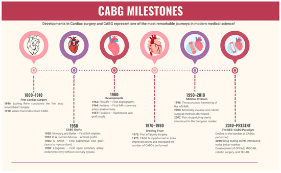 Cardiac surgery has evolved as a result of the efforts of many committed surgeons, who have offered an increasing number of therapies for various heart pathologies. The history of contemporary cardiac surgery may be traced back to the end of the nineteenth century. CABG was first described in 1910, and since then, it has come a long way, seeing many developments (Figure 1) [48,49]. In India, CABG surgery was first performed in 1975, around 13 years after its introduction in 1962 [50]. Around 10,000 CABG operations were performed annually in India in the mid-1990s. In the absence of central registration, accurate figures may not be discernible; however, according to industry sources, the current annual figure is around 120,000. CABG became more common in the 1980s as its safety improved. Some techniques that have gained popularity in India are OPCAB and the use of MICAS. In India, approximately 60% of surgeries are off-pump and most equipped centers carry out the majority of their cases as OPCAB. India has witnessed numerous legends in cardiac surgery, who have contributed not only to cardiac surgery but also to general cardiac care in various ways.