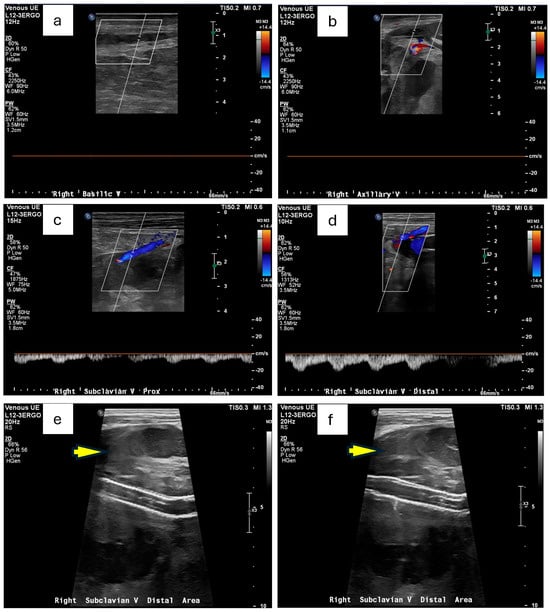 Doppler ultrasound of right arm venous system. (a,b) Occlusive thrombosis of the right axillary vein and right basilic vein is shown by the lack of the Doppler signal compared with other patent veins. (c,d) Examples of patent veins that showed Doppler signal, including the proximal (c) and distal (d) part of the subclavian vein. (e,f) Possibly questionable hematoma in the region of the right subclavian stent as pointed by the yellow arrow.
