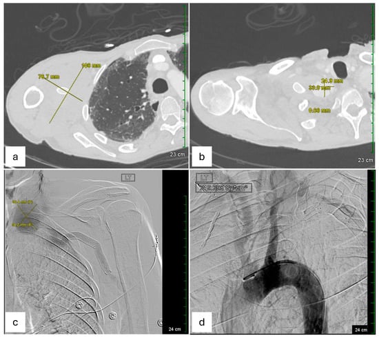 - Li, L.; Zhang, J.; Wang, R.; Li, J.; Gu, Y.; Yu, H. Endovascular Repair of a Right Subclavian Artery Aneurysm with Coil Embolization and Stent Graft: Case Report and Literature Review. Ann. Vasc. Surg. 2016, 36, 290.e1–290.e5. [Google Scholar] [CrossRef]
