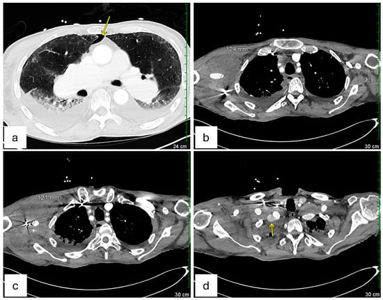 On hospital day 4 (3 days after endovascular repair of the left subclavian artery aneurysm), a repeat CT scan (Figure 3) was performed. Axial chest images (Figure 3a) showed a trace right pneumothorax (yellow arrow), unchanged since the day of admission. Sequential axial views (Figure 3b,c) demonstrated the right axillary hematoma, stable in size since hospital day 2 and without imaging findings suggestive of superinfection. Finally, an axial view of the proximal right subclavian artery (Figure 3d) revealed a type 1A endoleak in the right subclavian artery stent, indicating a possible proximal seal failure or ongoing infection that prevented full exclusion of the aneurysm (as pointed by the yellow arrow in Figure 3d). Although the patient’s white blood cell count gradually improved, and follow-up blood cultures eventually turned negative on hospital day 4 (as shown in Table 1), the possibility of a mycotic stent graft persisted. Vascular Surgery concluded that definitive source control might necessitate surgical graft explanation with extensive debridement, a high-risk procedure best conducted in a tertiary or quaternary center.